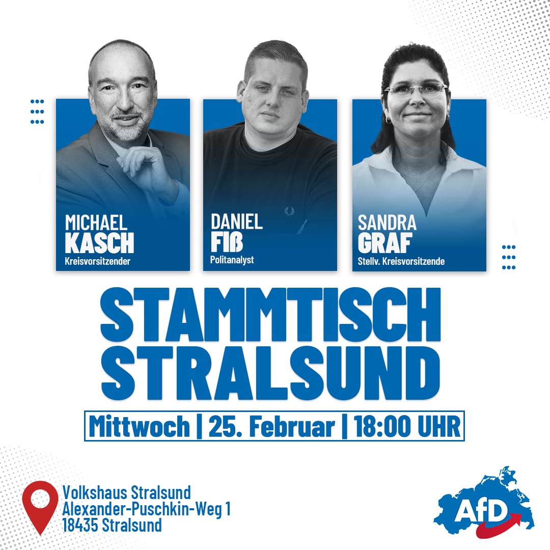 Liebe Mitstreiter, hiermit laden wir euch herzlich zu unserem nächsten Stammtisch ein. Datum: Dienstag, 25. FebruarUhrzeit: 18:00 UhrOrt: Volkshaus Stralsund Im Mittelpunkt des Abends stehen aktuelle politische Entwicklungen und die […]