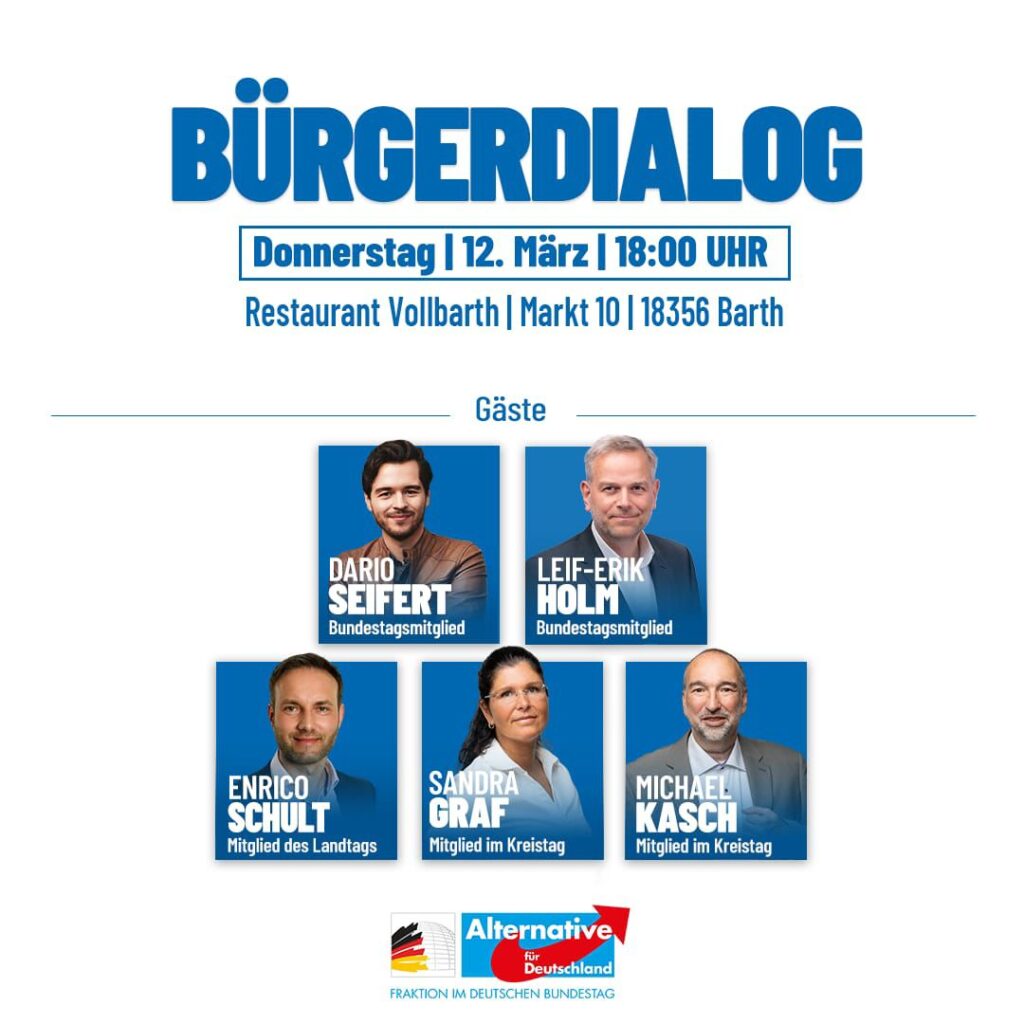 Bürgerdialog in Barth Wir laden herzlich zum Bürgerdialog am 12. März 2026 ein. Restaurant Vollbarth, Markt 10 in 18356 Barth Beginn: 18:00 Uhr Mit dabei sind: Dario Seifert MdB Leif-Erik […]