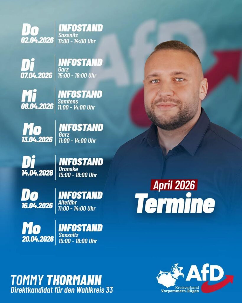 Tommy Thorman, unser Kandidat zur Landtagswahl 2026 für den Landkreis 33 Vorpommern-Rügen IV, ist auch wieder im April unterwegs. Schaut vorbei und kommt mit uns ins Gespräch. Wir freuen uns […]