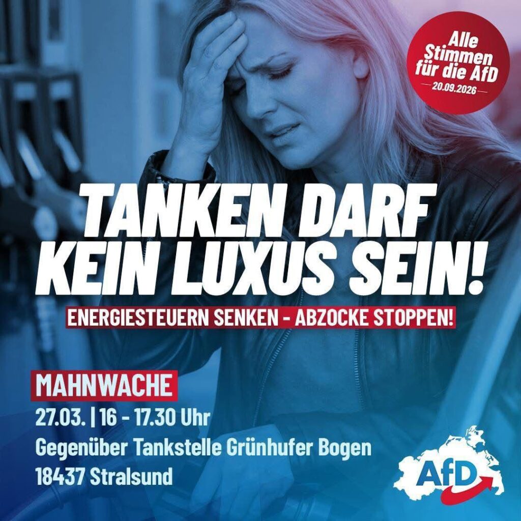Tanken darf kein Luxus sein! Am 27.03. setzen wir ein Zeichen! Von 16:00 bis 17:30 Uhr findet am Grünhufer Bogen in Stralsund eine Mahnwache statt. Immer mehr Menschen sind auf […]