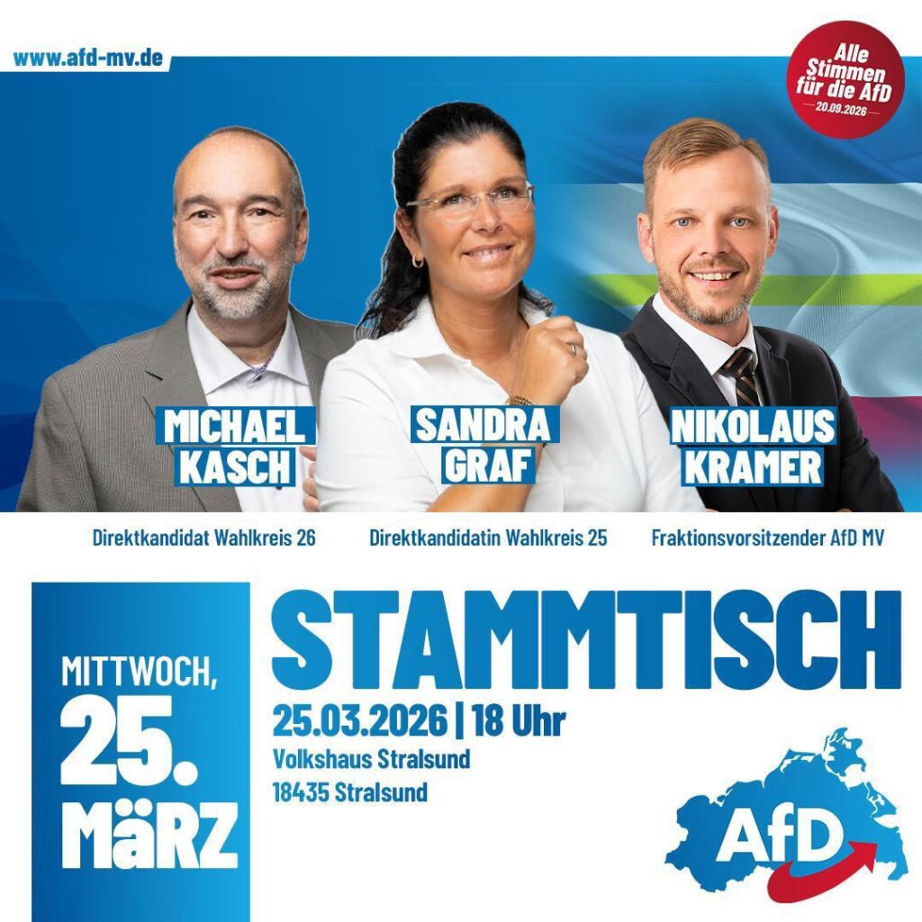 04.03.2026 Stammtisch in Grimmen. Der findet in der dortigen Kegelhalle statt und startet um 18:00 Uhr. Gäste sind der Landesvorsitzende Enrico Schult und der Wahlkreiskandidat Carlos Rodrigues. 06.03.2026 findet in […]