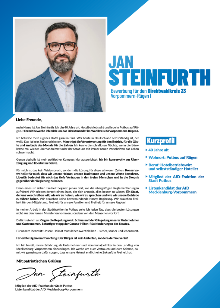 Im Mai wird die Nachwahl unseres Direktkandidaten im Wahlkreis 23 stattfinden, bei der wir der Versammlung einen geeigneten Bewerber vorschlagen wollen: Unser langjähriges Mitglied Jan Steinfurth AfD. 40 Jahre alt, Hotelbetriebswirt und selbstständiger Unternehmer. Er kennt die Herausforderungen unserer Zeit aus eigener Erfahrung und weiß, was es bedeutet, täglich Verantwortung zu tragen.